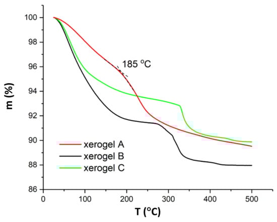 Dynamic TG curves of all three samples are shown in Figure 2. The course of thermal decomposition is similar for xerogels B and C, where ethanol and 2-propanol were used as a solvent while the mass-loss curve has a different course in the case of xerogel A, where the solvent was a mixture of 2-propoxy ethanol and 2-propanol. We ascribe the first step, which takes place from room temperature to approximately 200 °C, to solvent evaporation. In this step mass-loss rate is higher in the case of xerogel B and C. Up to 185 °C, xerogel B losses 6.0% of the initial mass, while xerogel C 8.10% and xerogel A 4.5%, respectively. The second and the third step, where condensation reactions continue, are partially overlapped. For xerogel B mass loss is additional 3.0% in a temperature range from 270 °C to 350 °C and from 350 °C to 430 °C another 0.5%. Similar behavior is observed for xerogel C except that the second step begins at higher temperature, i.e., 325 °C. Successive reactions are much more overlapped in the case of xerogel A. Second step occurs in a temperature range from 185 °C to approximately 270 °C with a mass loss of 3.8% and turns then to the third step with a slower mass loss. Mass for the sample A is not constant even at 500 °C.