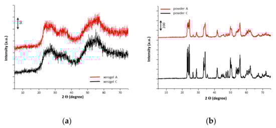 The XRD measurements of the xerogels and powders were performed using a PW 1710 Philips X-ray diffractometer (Philips, Almelo, Netherlands). The XRD spectra of the WO3 xerogels prepared by either a mixture of 2-propoxy ethanol and 2-propanol or solely with 2-propanol are presented in Figure 3a, while the corresponding powders obtained after annealing of the xerogel at 450 °C for 1 h are shown in Figure 3b. The results confirmed that both WO3 xerogels, regardless on the solvent used for the sol preparation are amorphous while annealing of the xerogels leads to the crystallization. The analysis of the XRD spectra of the WO3 powders reveals the presence of the monoclinic phase, which is well in agreement with our previous results for the sample C [].