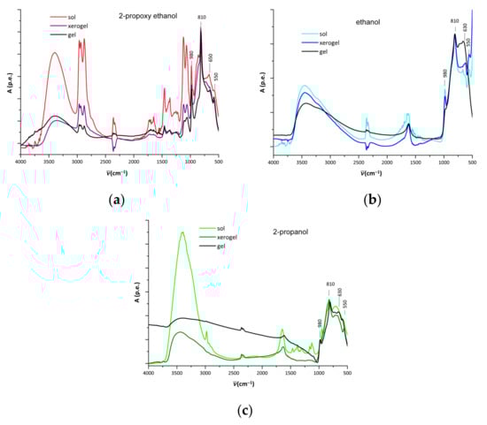 In the IR spectra of the wet sols prepared by different solvents (Figure 4) the bands characteristic for the –CH groups (2840–3000 cm−1) of the alcohol are present. The comparison of the IR spectra of the wet and dried sols-xerogels shows a noticeable difference in the intensity of the –CH bands. The results confirm that the alcohol entirely evaporates during drying of the sols at room temperature when the sols are prepared by ethanol or 2-propanol (Figure 4b,c), while it remains present when the 2-propoxy ethanol (Figure 4a) is used.