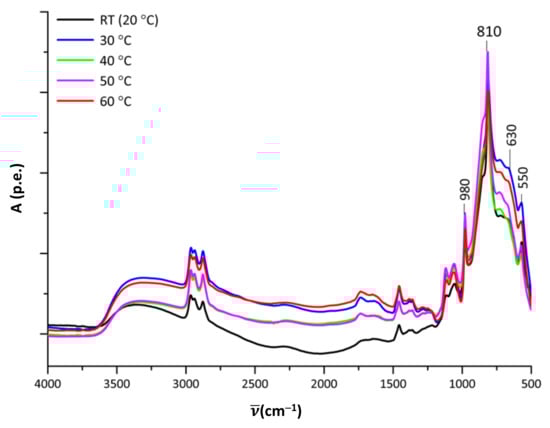 To compare how the temperature of the WO3 ink influences the cross-linking of the tungsten polyhedra and gel formation we have taken the IR spectra after the gelation of the WO3 sol in a rheometer at the temperatures (20 °C, 30 °C, 40 °C, 50 °C and 60 °C) at which the rheological properties of the sols were examined (Figure 5).