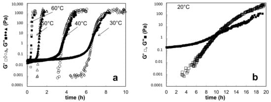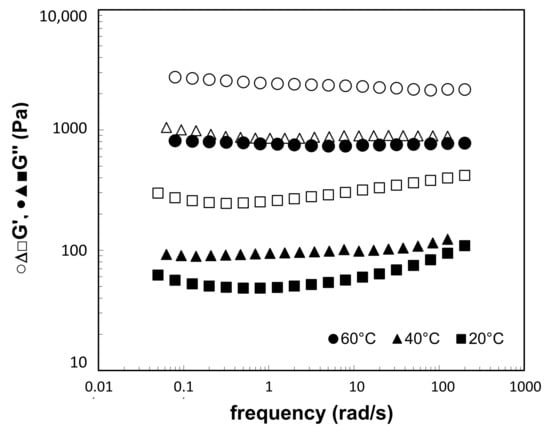At the end of gelation process the initial Newtonian structure of the sol changed to solid-like gel at all temperatures examined. The formed gels were examined with oscillatory tests in linear viscoelastic range to evaluate the influence of the temperature on the structure of formed gels. For the sake of clarity only gels, formed at temperatures 60 °C, 40 °C and 20 °C, respectively, are presented in Figure 12. The results indicate that all formed gels exhibited similar dependences of G′ and G″ on the frequency of oscillation. The differences in the structure can be observed regarding consistency of the gels. Higher temperature of the gelation process led to faster gelation process and higher consistency of formed gel. Thus, the gel, formed at the highest temperature exhibited the highest consistency with the most “solid-like” structure, while the gel, formed at 20 °C, exhibited softer gel structure with lower consistency.