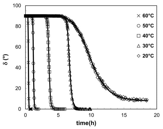 where δ1 and δ2 are the highest (initial) and the lowest (the end) values of phase shift angle, respectively, tg is the time of sol-gel transition, while s jointly with W controls the rate of approach to the δ2 asymptote. The values of the five parameters, obtained by fitting the experimental data are presented in Table 1, while the experimental data of phase shift angle δ and calculated values obtained with the above equation are presented in Figure 8. The results show excellent agreement of the experimental data with the predicted values for all five temperatures, used in the presented study. The five-parameter logistic model enabled the exact determination of the time at which sol to gel transition occurs (tg) together with precise viscoelastic properties of formed gels (δmin). Moreover, the model can be used for accurate prediction of total rate and time of sol-gel process (W, s).
