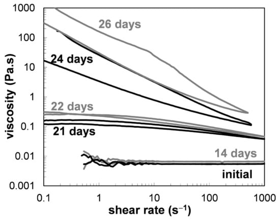 In the ex-situ characterization various rheological tests were performed under destructive and non-destructive shear conditions. First, the flow behavior was followed with flow tests under destructive shear conditions (Figure 10). One day after the sol preparation, the sol (Figure 10, initial) exhibited Newtonian flow behavior with constant viscosity of 0.0054 Pa.s (at T = 23 °C). 14 days after the preparation the sol maintained the Newtonian character, while the value of the viscosity slightly increased to 0.0065 Pa.s (at T = 23 °C). Higher increase of the viscosity and the first deviation from Newtonian flow behavior was observed on the 21st day after the preparation. The next day (22nd day) the viscosity again slightly increased with similar flow behavior, while 24th day after the preparation the flow behavior of the solution significantly changed to pronounced shear thinning flow behavior, where the viscosity decreased for almost three decades as the shear rate increased from 0.1 to 1000 s−1. A constant decreasing of the viscosity curve from the low to the high shear rates indicates that these solutions showed some structure stability at rest [], while hysteresis loop during the decreasing of the shear rate towards initial value (0.1 s−1) indicates time-dependent flow properties during structure recovery.