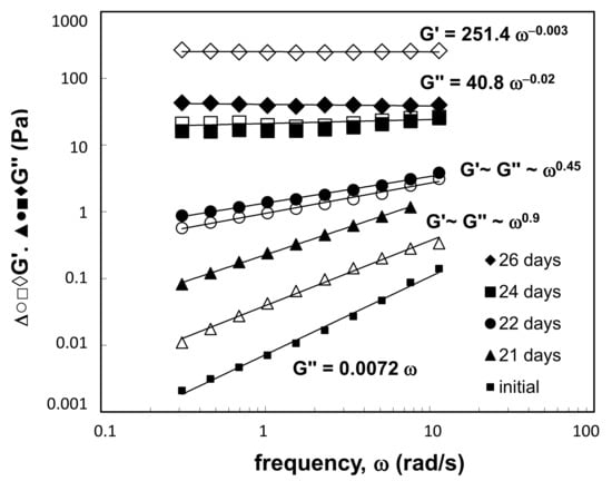 For chemical, i.e., covalently cross-linked gels formed in our study, linear viscoelastic behavior has been extensively investigated in the vicinity of the sol-gel transition point. Winter and Chambon [,] showed that at critical gel point dynamic moduli follow a simple power law: G′ (ω) ≈ G″ (ω)~ωn, where n depends on the particular gelation mechanism. In our work, the transition from sol to gel was observed for the sol at 23 °C (Figure 11), where after 22 days the G′ and G″ depended on the frequency by the order of 0.5 (G′~G″~ω0.5).
