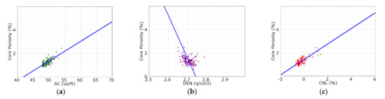 Cross plot of the core porosity and the 3-porosity curve of well X1. (a) the core porosity versus the AC curve; (b) the core porosity versus the DEN curve and (c) the core porosity versus the CNL curve.