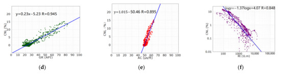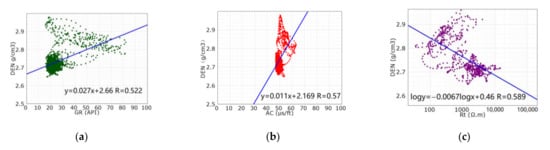 Secondly, we analyzed the relationship between the logging curves. It is known that the GR curve is sensitive to the clay, the AC, DEN and CNL curve can reflect the lithologies and physical properties of the reservoir simultaneously, and the RT curve can reflect the oil/gas-bearing properties [8,9]. We used the CNL curve and the DEN curve of well X1, respectively, to make a correlation analysis with other curves (Figure 3). It turned out that the correlation coefficients of the GR, AC and RT curve with the CNL curve were significantly higher than that with the DEN curve. The reason is that the high-density drilling fluid caused expansion of hole diameter and induced fracture in some sections of wells, which affected the AC curve and the DEN curve [10,11,12]. Therefore, it was more appropriate to reconstruct the CNL curve than the DEN curve.