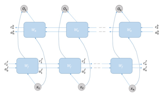 where, is the input value of the BI-LSTM network at time t; is the output value of the BI-LSTM network at time t; is the value of the forward hidden layer at time t; is the value of the forward hidden layer at time t − 1; V is the weight of the output layer in the forward calculation; g is the corresponding activation function; U is the weight of the input layer; f is the corresponding activation function; W is the corresponding weight of the hidden layer; V′ is the weight of the output layer in reverse calculation; U′ is the weight of the output layer; W′ is the weight of the hidden layer; is the output of LSTM memory unit in reverse calculation at time t; and is the output of LSTM memory unit in reverse calculation at time t − 1. The output value of the BI-LSTM network at time t was obtained by the forward and reverse output.
