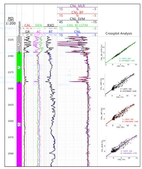Given the influence of the reservoir lithologies, the physical properties and the oil/gas-bearing properties on the logging curves, we used three logging curves, GR, AC and RT, as the input curves for CNL reconstruction. Taking the logging data of well X1 as the input sample and well X5 as the test sample, experiments were conducted by using multiple linear regression (MLR), BP neural network, support vector machine (SVM, and BI-LSTM [5,14,28]. According to the experiment results, the advantages of the reconstruction method for the curve can be discussed through three test parameters: the correlation coefficient (R), root mean square error (RMSE) and determination coefficient (R2). The closer R2 is to 1, the more accurate estimate is.