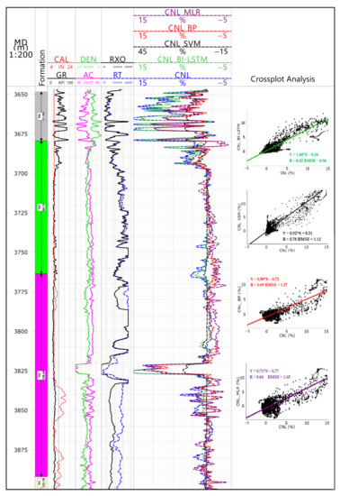 Figure 6 shows the prediction effect of different algorithms in well X5. The main contributions are as follows: For most well sections, the predicted curve was found to be consistent with the measured curve in trend and, for some well expansion sections, the predicted curve of the multiple regression and the BP algorithm was diametrically opposite to the measured curve. Three-parameter analysis showed that the prediction effect of these two algorithms was poor: R was less than 0.7, RMSE was greater than 1.2 and R2 was less than 0.6. In comparison, though the prediction effect of the support vector was rather ideal, BI-LSTM showed greater advantages. For BI-LSTM, R was significantly higher, RMSE was only 0.96 and R2 was up to 0.71. Through the BI-LSTM algorithm, we achieved a pseudo-neutron curve. For such a pseudo-neutron curve, the frequency band distribution range was narrower than the original curve, the high-gamma segment was smaller than the original curve and the low-gamma segment was larger than the original curve. After standardization, the pseudo-neutron curve was found to be consistent with the original curve in the low-gamma segment, but there was still a large error in the high-gamma segment. Significantly, the processing results did not interfere with the identification of the reservoirs and the calculation of the reservoir parameters, although large errors existed. The main reason for this is that the high-gamma segment was not the favorable reservoir.