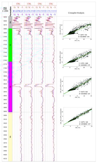 For the machine learning algorithm, in general, the more training samples we have, the more regularity information of the data set we achieve [4,29]. With the implementation of the training tasks and the accumulation of the experience, the model acquired a strong generalization ability. We took the data of well X1, X2, X3 and X4 as the training data in turn and took the data of well X5 as the effect test. This was done to discuss the influence of the data information on the prediction result of BI-LSTM.