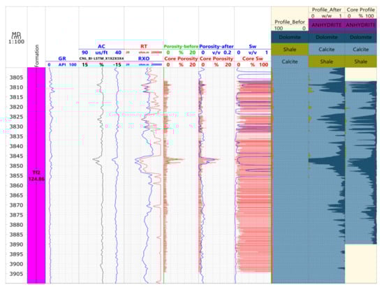 After that, the core porosity was found to be consistent with the logging porosity in trend, with a correlation coefficient of 0.896. For this kind of optimum processing result, the data points mostly distributed near the 45° line (Figure 9), the relative error was 14.7% and the absolute error was only 0.28. By comparison, the evaluation indexes were improved dramatically after curve construction (Table 5). The treated lithology profile was found to be consistent with the lithification analysis profile, basically, which demonstrates that the construction method of BI-LSTM curve is feasible.