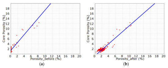 Cross plot of the core porosity and porosity of well X6. (a) the core porosity versus porosity before curve construction; (b) the core porosity versus log porosity after curve construction.