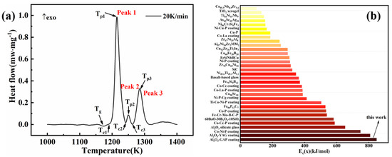 (a) DSC curve of the Al2O3-GAP amorphous coating at the heating rate of 20 K/min; (b) initial crystallization activation energy Ec(x) obtained by the Kissinger method for some typical amorphous materials reported [22,29,30,31,32,33,34,35,36,37,38,39,40,41,42,43,44,45,46,47,48].