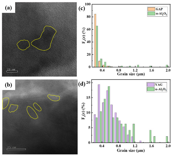 (a,b) HRTEM images of as-sprayed Al2O3-GAP amorphous coatings after heat treatment at 1173 K and 1223 K for 10 min; (c,d) grain size distribution of different crystalline phases in Al2O3-GAP and Al2O3-YAG amorphous coating.