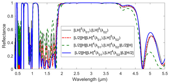 Again, we needed to minimize the reflection oscillations in the pass band to ameliorate the efficiency of the double-stack filter; accordingly, we followed the strategy proposed in [4,7]. Thus, we considered several 1D-PC double-stack filters with various configurations and different anti-reflection coating (ARC) layers labeled as [ARC]1 [LH]N1(λ01)⋅[LH]N2(λ02) [ARC]2. Here [ARC]1 and [ARC]2 are anti-reflection coating layers at the beginning and end of the structure, respectively, and N1 and N2 are the numbers of periods in each stack within the structures. The normal-incidence reflectance spectra for these structures were calculated and are displayed in Figure 5. From this figure, it can be noted that wide PBGs with high reflectance levels were achieved for all configurations. The only thing that made a difference was the reflectance levels within the pass bands of the different structures. Among the proposed structures, we expect that the configuration [L/2][H][LH]4(λ01)⋅[LH]4(λ02) [L][H/2] is the most suitable to be used as spectral filter for TPV systems because it possessed the lowest reflectance level within the filter pass band.