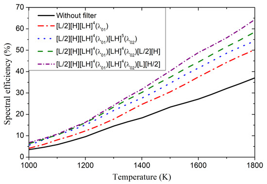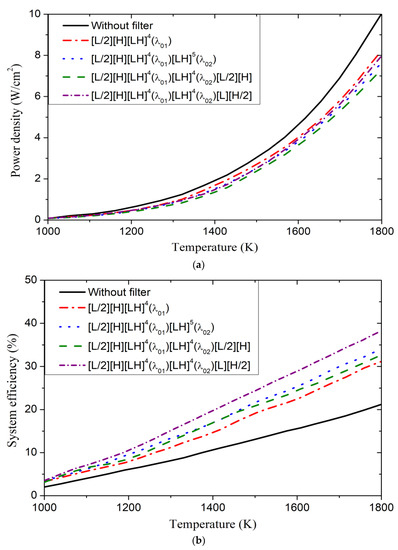 In fact, according to Equation (2), we can deduce that at specific temperatures a higher in-band transmittance (lower in-band reflectance) was associated with a higher power density. Thus, as the single-stack filter possessed a lower in-band reflectance than the double-stack configurations, the power density was higher in the single-stack structure. Nevertheless, the single-stack structure suffered from weak efficiency because of its tight stop band, and we see from Figure 7b that the double-stack structures exhibited higher efficiencies. Among the considered double-stack structures, the one with the configuration [L/2][H][LH]4(λ01)⋅[LH]4(λ02) [L][H/2] exhibited higher power density and efficiency.