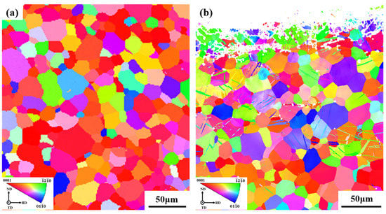 Figure 3 shows the inverse pole figure (IPF) maps of the cross-section of pure Zr samples before and after USSP treatment. As seen from Figure 3a, the as-received sample exhibits a uniform microstructure and no deformation twinning was observed. The majority of grains are equiaxed with an average grain size of ~20 μm. As seen from Figure 3b, the HESPed sample shows a gradient microstructure with notable grain refinement on the surface layer. The thickness of the significant grain refined layer is more than 40 μm. The top refined region is white and barely resolved by using EBSD, which is due to the nanocrystalline nature and the residual stress. From the depth of 40 μm to the matrix, there is a large number of deformation twinning. Zr alloys possess a hexagonal close-packed structure and deform by dislocation slip; twinning becomes important to accommodate deformation due to the limited number of slip systems. The microstructure evolution from the surface to the matrix is in the sequence of the surface nanocrystalline layer, transition layer (including broken grains and twins), and matrix.