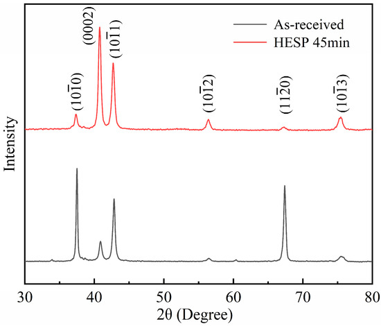 Figure 4 presents the XRD patterns of the as-received and the HESPed at the topmost surface. Compared with the as-received sample, the HESPed sample shows different diffraction characteristics. After HESP treatment, the intensity of (0002), (10), (), and (10) peaks become strong. The peaks of (10) and () are reduced greatly. Meanwhile, the peaks’ width of the (0002), (10), () and (10) are broadened. This result can be attributed to grain refinement, lattice deformation, and micro-strain development. It is well-established that the variations in the full-width half maximum (FWHM) can quantitatively characterize the evolution in microstructure, such as the microstrain and crystallite size [24]. Such a larger FWHM indicates a smaller grain size, and the grain size can be calculated according to the Williamson-Hall formula [20]. The calculated average crystallite size on the HESPed sample surface is ~14.8 nm.
