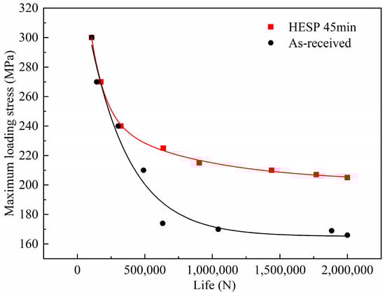 Figure 7 shows the S-N curves of the as-received and the HESPed samples. The fatigue limit of the as-received sample is 166 MPa, whereas that is increased to 220 MPa after HESP treatment, which is 23% higher than the as-received. It suggests that the HESP could improve the fatigue strength of pure Zr. On the one hand, the CRS induced by HESP treatment can offset part of the external load and postpone propagation of the crack. On the other hand, the surface nanolayer has a strong fatigue resistance to plastic deformation. The surface gradient nanostructured layer and work hardening state produced by HESP treatment are helpful to prevent dislocation slip, thereby effectively inhibiting fatigue crack initiation in the top surface [26].