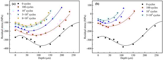 The residual stress field (RSF) is usually characterized by four characteristic parameters [28]: the surface residual stress σsrs, the maximum residual stress σmrs, the depth of maximum residual stress Zm, and the depth of RSF Z0. Table 1 gives the characteristic parameters of RSF under different stress amplitudes in tensile fatigue tests. Figure 9 shows the RSF distribution of the HESPed sample under different cycles at stress amplitudes of 210 MPa and 320 MPa, respectively. Compared with the initial value, the residual stress is released in different degrees after different cycle numbers. As can be seen from Table 1, under stress amplitude of 210 MPa, σsrs is decreased by 29.7%, 40.0%, 62.0%, 63.3% and σmrs is decreased by 31.4%, 47.0%, 62.8%, 67.1% at 100, 103, 5 × 105 and 8 × 105 cycles, respectively. As can be seen from Table 1, under stress amplitude of 320 MPa, σsrs is decreased by 58.0%, 80.0%, 84.7% and σmrs is decreased by 69.4%, 71.5%, 77.3% at 100, 103 and 5 × 104 cycles, respectively. As shown in Figure 9a,b, it can be seen that RSR is faster under 320 MPa and the RSR starts with a fast rate in the initial stage for two stress amplitudes, and the relaxation rate gradually decreases and tends to stabilize with the increase of the cycle numbers. The RSR generated by the first 100 cycles is decisive in the whole release process.