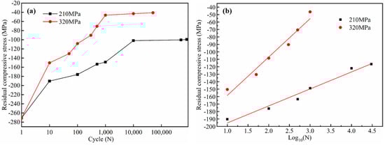 Figure 10 shows the variation of σsrs with the cycle numbers at different stress amplitudes. Figure 10a shows that σsrs is released with the increase of cycles, and the σsrs relaxation is faster under stress amplitude of 320 MPa. The amount of σsrs relaxation accountable for the total relaxation was 51.6% and 70.8% in the first 100 cycles for stress amplitudes of 210 MPa and 320 MPa, respectively. At the initial stage, the residual stress relaxes drastically which is usually regarded as the process of static loading stress relaxation [30]. The σsrs relaxation process is analyzed in detail after 10 cycles and it can be observed that the σsrs have a linear relationship with the logarithm of the cycle numbers. Figure 10b shows the certain positive correlation between σsrs and the logarithm of cyclic numbers. The linear correlation formula is defined as Equation (3):