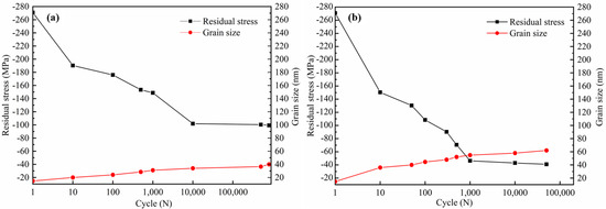 Residual stress and grain size variation with cycle numbers under different stress amplitudes: (a) 210 MPa; (b) 320 MPa.