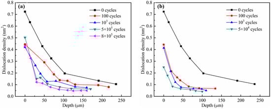 Figure 13 illustrates the variation of dislocation density along the depth of the HESPed sample under different cycles and different stress amplitudes. After HESP treatment, high dislocation density is formed in the strengthening layer. As can be seen in Figure 13a,b, the dislocation density decreased rapidly at the 100-th cycles, and then decreased slowly and tended to be stable at the later stage. Compared with the stress amplitude of 210 MPa, the dislocation density decreased more under 320 MPa at the same cyclic number.
