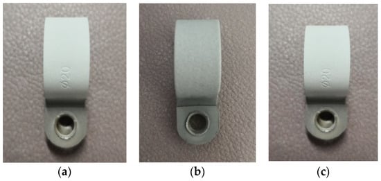 Oerlikon Metco 9MC plasma spraying equipment (Oerlikon Metco Surface Technology, Shanghai, China) was used to plasma spray the clamps to prepare three kinds of hard-coated clamp. Images of the clamps following the coating are provided in Figure 1. During the orthogonal experiments, the coating material, the coating thickness, the clamp material, and three other parameters were studied with respect to their vibration damping effect on the clamp-piping system, as shown in Table 1. On this basis, a 3-level 3-factor orthogonal test table L9(33) was designed. The resulting spraying experiment scheme is shown in Table 2.