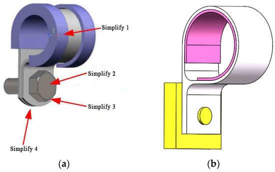 Simplified position and front-to-back comparison of the geometric model of the clamp. (a) Not simplified; (b) Simplified.