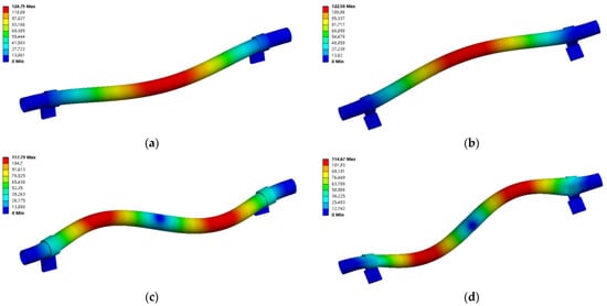 Vibration shape diagram of the 304 stainless steel clamp-piping system. (a) Level 1; (b) Level 2; (c) Level 3; (d) Level 4.