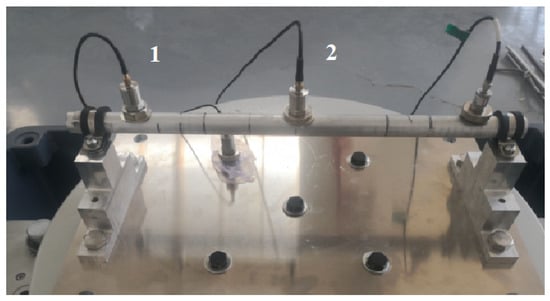 The experiment used a Nitronic40 (XM-10) S21900 stainless steel pipe with an outer diameter of 20 mm and a wall thickness of 1 mm. The pipeline was installed on the vibration test bench by fixing it with clamps at both ends; two acceleration sensors were placed onto the surface of the pipeline; an INV3062 V type 24-bit network-distributed acquisition instrument was used to collect the vibration model of the No. 1 sensor near the clamp and the No. 2 sensor in the middle of the pipeline. Figure 8 shows the setup for the vibration response test of the clamp-piping system, and Table 9 shows the test table for the vibration response test of the hard-coated aviation hydraulic clamp-piping system.