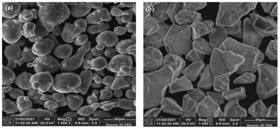 SEM images of coating material (a) Al alloy powder (b) Alumina powder.