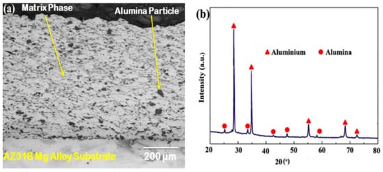 The optical microstructure view and XRD pattern of the Al alloy/alumina MMC coatings on AZ31B Mg alloy are shown in Figure 3a,b. From Figure 3a, it is inferred that the coating consists of deformed Al alloy and alumina particles. The first layer of coating is developed with greater adhesion between the substrate and coating due to the sandblasting process [,]. The adhesion strength of the coating was determined through a universal tensile testing machine (FIE02, Fuel Instruments and Engineers Pvt. Ltd., Chennai, India). The adhesion strength of the coating was about 48.2 MPa. Due to low processing temperatures [,,], oxidation does not occur on the deposit. Due to low pressure process parameters [,], the metallurgical bonding between the interface of the matrix (Al alloy powder) and reinforcement (alumina) phase is not better. Numerous research studies arrived at the same results [,,,,,,]. Figure 3b illustrates the XRD pattern of the coating. The peak shifting to a lower 2θ value indicates an expansion to a higher lattice parameter and the peaks confirm that the deposit is a metal matrix composite coating because the two peaks, aluminium and alumina, were found in the coating.