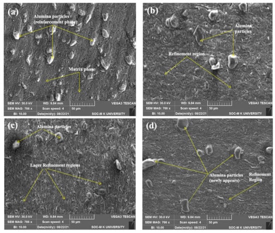 The SEM photographs of the LPCSed and FSPed Al alloy/alumina coatings are shown in Figure 5. When compared with LPCSed samples, the level of splitting and dispersal of ceramic particles in the matrix phase rises after FSP, with some alumina particles retaining their earlier larger size. That is owing to the shearing force developed by the stirring motion of the tool on the coated samples. Then refining can result in enhanced mechanical properties due to a dispersal strengthening mechanism, as verified by previous research [,]. Although the continual disturbance of alumina particles formed during every run of FSP results in a decrease in their size, the higher the rise of FSP (3rd run), the breakage of ceramic particles becomes very small. The alumina particle size and dispersal levels of the second and third runs of FSPs are more or less equal, as shown in Figure 5c,d.