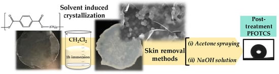 Polyethylene terephthalate (PET) bottle grade (intrinsic viscosity (IV) = 0.80 ± 0.02 dL g−1) in pellet form was provided by Caiba (Valencia, Spain). Solvents as dichloromethane (DCM), dimethylformamide (DMF), dimethyl sulfoxide (DMSO), dioxane, acetone and hexane from Sigma-Aldrich (Darmstadt, Germany) have been used without prior purification. An aqueous solution of 20 wt.% NaOH has also been used. For surface modification, a trichloro (1H, 1H, 2H, 2H-perfluorooctyl) silane (PFOTCS), 97% purity, Mw = 481.54 g·mol−1 provided by Sigma-Aldrich has been used.