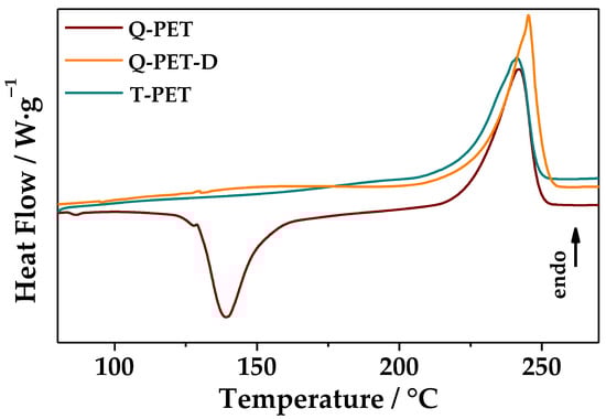 Figure 2 shows DSC heating curves of PET films before and after immersion in DCM, namely Q-PET and Q-PET-D, respectively. In addition, the sample prepared under slow cooling conditions to boost its crystallization, T-PET, was included to compare the thermal histories.