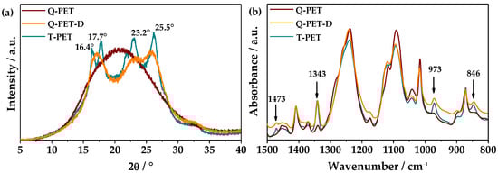 X-ray diffractions display in Figure 3a shows that, as expected, Q-PET does not exhibit diffraction peaks corresponding to crystalline entities, but only the amorphous halo, whereas T-PET shows the characteristic diffractions of crystalline PET [30] located at 16.4°, 17.1°; 23.2° and 25.5°. After the solvent treatment with DCM, Q-PET-D also showed these diffractions, although less defined, probably due to the scattering produced by the rough surface.