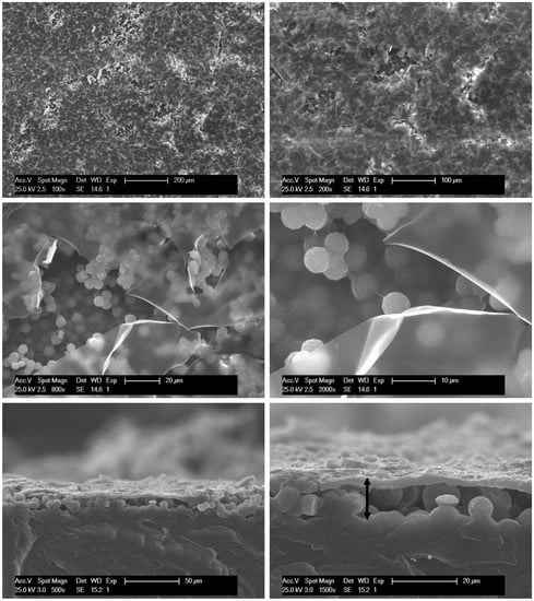 The surface morphology and section of the films were visualized by scanning electron microscopy (SEM) using a Philips XL30 microscope (Philips, Amsterdam, The Netherlands) and a HITACHI S-8000 (Hitachi High-Tech Group, Tokyo, Japan). The samples were coated with a layer of gold-palladium alloy before imaging.
