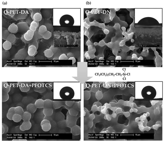 SEM micrographs of the surface and the section of the surfaces after the skin removal treatment: Q-PET-DA (a) and Q-PET-DN (b); and after the PFOTCS modification (down).