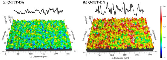 Figure 6 shows an example of three-dimensional images of both surfaces where the more heterogeneous character of Q-PET-DN is suspected.