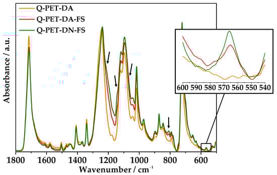 Attending to the spectra shown in Figure 7, the bands attributed to the silane moieties, absent in Q-PET-DA, were more intense in the sample, which came from NaOH immersion, namely Q-PET-DN-FS. These bands are marked as arrows in the Figure and correspond to the symmetric stretching of C-F2 at 1188 and 1143 cm−1, the Si-O-Si asymmetric and symmetric stretching at 1074 cm−1 and 809 cm−1, respectively. The 897 cm−1 band is attributed to the Si-OH bond, so it is considered that in both cases there is hydrolyzed and uncondensed silane on the surface. The infrared region between 620 and 540 cm−1 corresponding to modes of vibration of the C-F groups of fluorinated silane was analyzed. In the case of Q-PET-DN-FS (washed with NaOH), the intensity of this band is slightly higher. These facts could indicate higher adsorption of the silane on the surface of this sample, once more reinforcing the hypothesis of the presence of -OH groups on the surface that may favor the adsorption and condensation of the silane.