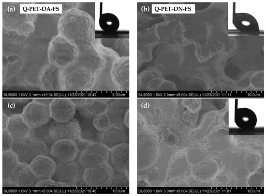 SEM images of samples Q-PET-DA-FS (a,c) and Q-PET-DN-FS (b,d) on the surface at 5000× (a,b,d) and 10,000× (c) and images visualizing the Δθw values of these surfaces.