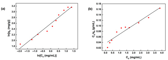 | n | KF [(mg·g−1)/(L·mg)1/n] | R2 | qm (mg·g−1) | KL (L·mg−1) | R2 |
