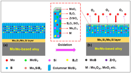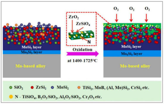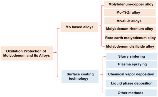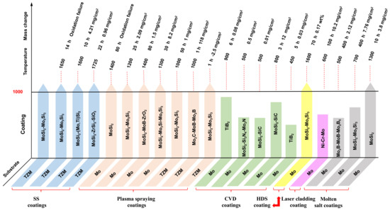 With the rapid development of aerospace, national defense and the military industry, electronics, and so on, increasing attention has been paid to the research and application of refractory metals [1,2,3,4]. Molybdenum and molybdenum-based alloys have a high melting point (2620 °C), good high-temperature mechanical properties and high conductivity and thermal conductivity, and are widely used in high-temperature structures [5,6,7,8,9,10]. However, the alloys have a poor oxidation resistance, and the “Pesting oxidation” at 400–800 °C and oxidation decomposition above 1000 °C are the main factors that limit their application [11,12,13,14]. At present, the alloying and surface-coating technology are the main methods to increase the oxidation resistance of the basal materials [15,16]. The types of molybdenum alloys and the various surface coating technologies of Mo and its alloys are shown in Figure 1 [17,18,19,20]. It can been seen that the Ti, Zr, W, Re, Si, B, Hf, C and rare earth oxides are often added to pure Mo as beneficial elements to prepare molybdenum alloys. However, the result of alloying is not satisfactory when considering the mechanical properties and high-temperature oxidation resistance of the alloys [21,22]. For example, adding a certain amount Ti element to the alloy can enhance its strength, but it will further accelerate the oxidation of the alloy [23]. Mo–Si–B alloys have satisfactory high temperature oxidation resistance, but their fracture toughness is poor. Mo–Ti–Si–B alloys are considered as a promising ultra-high temperature material. However, their oxidation resistance and mechanical properties need to be further studied [24]. In contrast, the surface-coating technology can improve the oxidation resistance of the alloy at high temperature with as little impact on the mechanical properties as possible. Therefore, it is favored by the majority of researchers [25].