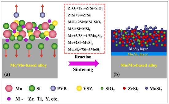 The growth mechanism of the SS coatings and the main equations involved in the reaction process are shown in Figure 4. With the mutual diffusion between mixture and substrate, a dense MoSi2 layer formed on the molybdenum alloys substrate. The content of Si element gradually decreased in the process of diffusion into substrate, and finally a thin interface layer (Mo5Si3 and Mo3Si) formed with low silicon concentration between MoSi2 and substrate. The results show that the growth mechanism of the interface layer in the MoSi2 coating system is the same as that in MoSi2/Mo diffusion couple, but the growth rate of Mo5Si3 is much higher than that of Mo3Si [49,50]. In addition, an appropriate amount of beneficial elements (M), such as Zr, Ti and Y are usually added to the slurry mixture to optimize coating structure [51,52,53].