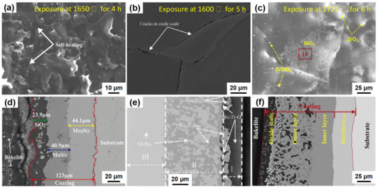 Surface and cross-sections images of SS coatings under different exposure conditions; (a,d) pure MoSi2 coating, reprinted with permission from [45]; reproduced from (Chakraborty et al., 2016). (b,e) MoSi2-(Mo, Ti)Si2 coating, reprinted with permission from [46]; reproduced from (Cai et al., 2017). (c,f) Si-Mo-10YSZ coating, reprinted with permission from [44]; reproduced from (Cai et al., 2018).