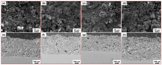The SEM images and the process conditions of plasma-spraying coatings are shown in Figure 8 and Table 4, respectively [52]. It is obvious that the coatings have a very rough surface, with a large number of pores and a wide diameter. In addition, the coating surface contains a great deal of spherical particles, which is the result of “splashing” liquid droplets generated when the mist particles collide with the coating surface during the spraying process, then deposited on the coating surface again and cooled, as shown in Figure 8a–d. The densification of the cross-sectional coatings is very poor with many pores and uneven distribution, as shown in Figure 8e–h. The uneven particle size and melting degree of sprayed powder during spraying are the main reasons for this result. Meanwhile, the carrier gas remaining inside the coating also exacerbates this result [64,65]. The research shows that the microhardness and bonding strength of the coating can be improved by appropriately increasing the spray gun power or reducing the Ar gas flow rate [57].
