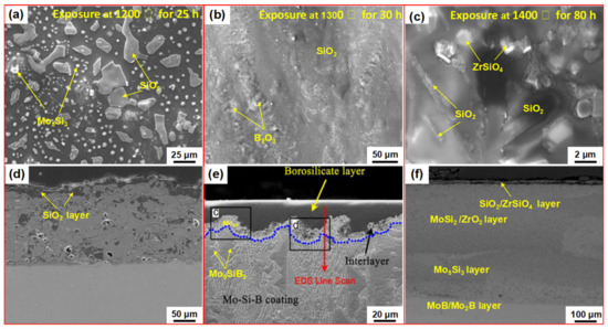 SEM image of surface and cross-section plasma spraying coatings after oxidation under different conditions. (a,d) Pure MoSi2 coating, reprinted with permission from [57]; reproduced from (Deng et al., 2019). (b,e) Mo–Si–B coating, reprinted with permission from [58]; reproduced from (Zhu et al., 2019). (c,f) MoSi2-MoB-ZrO2 coating [59]. Reprinted with permission from [59]; reproduced from (Chakraborty et al., 2011).