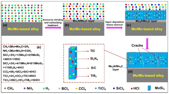 The diagram of growth mechanism of CVD coating on molybdenum and Mo-based alloys. (a–d) are the different stages of diffusion reaction, (e) is the equations involved in the reaction.