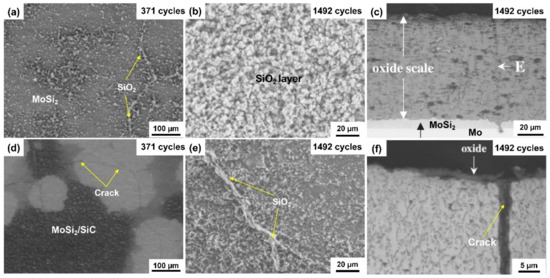 Surface and cross-sections images of oxidized coatings with different types and different cyclic oxidation times at 500 °C. (a–c) MoSi2 coating; (d–f) MoSi2/β-SiC nanocomposite coating. Reprinted with permission from [75]; reproduced from (Yoon et al., 2004).